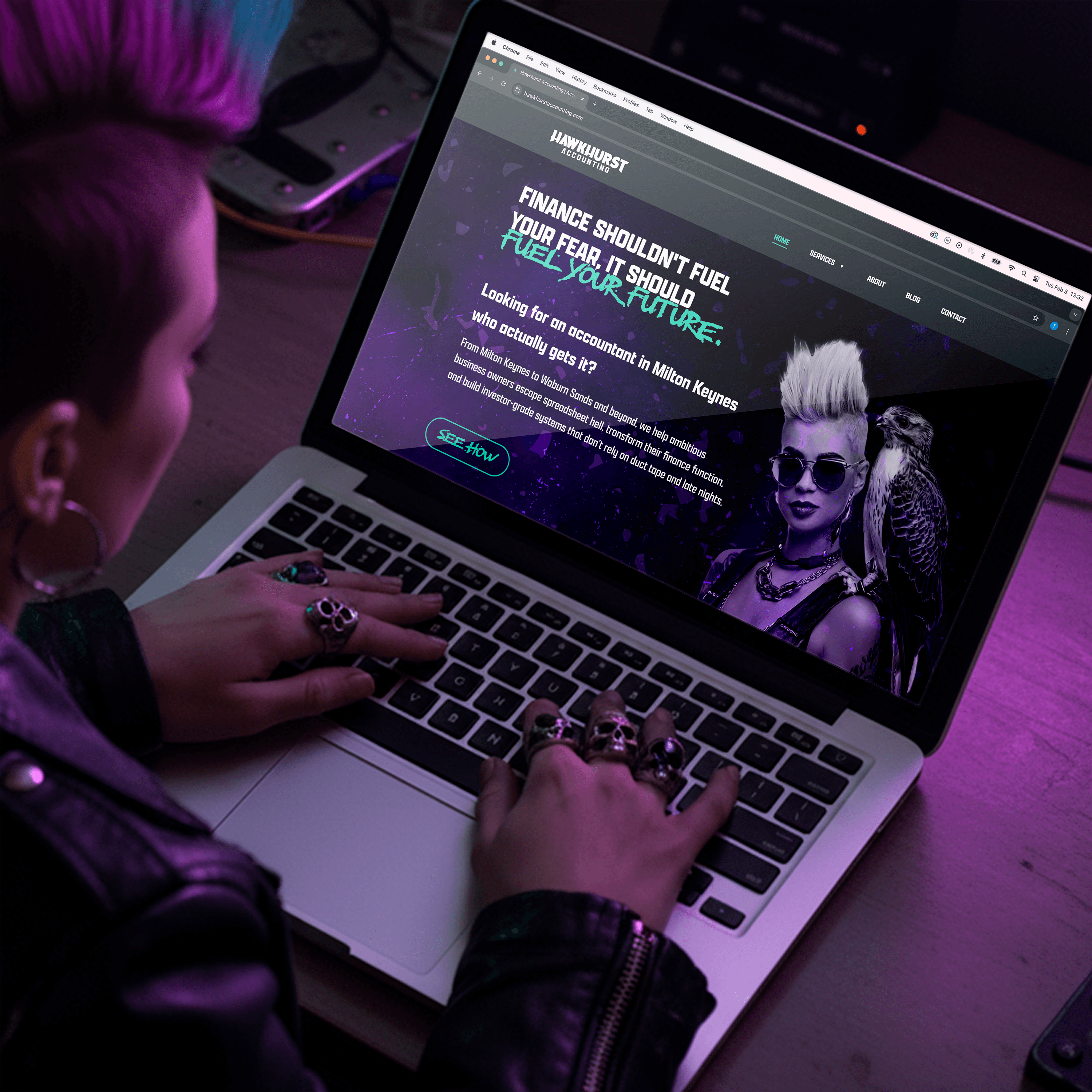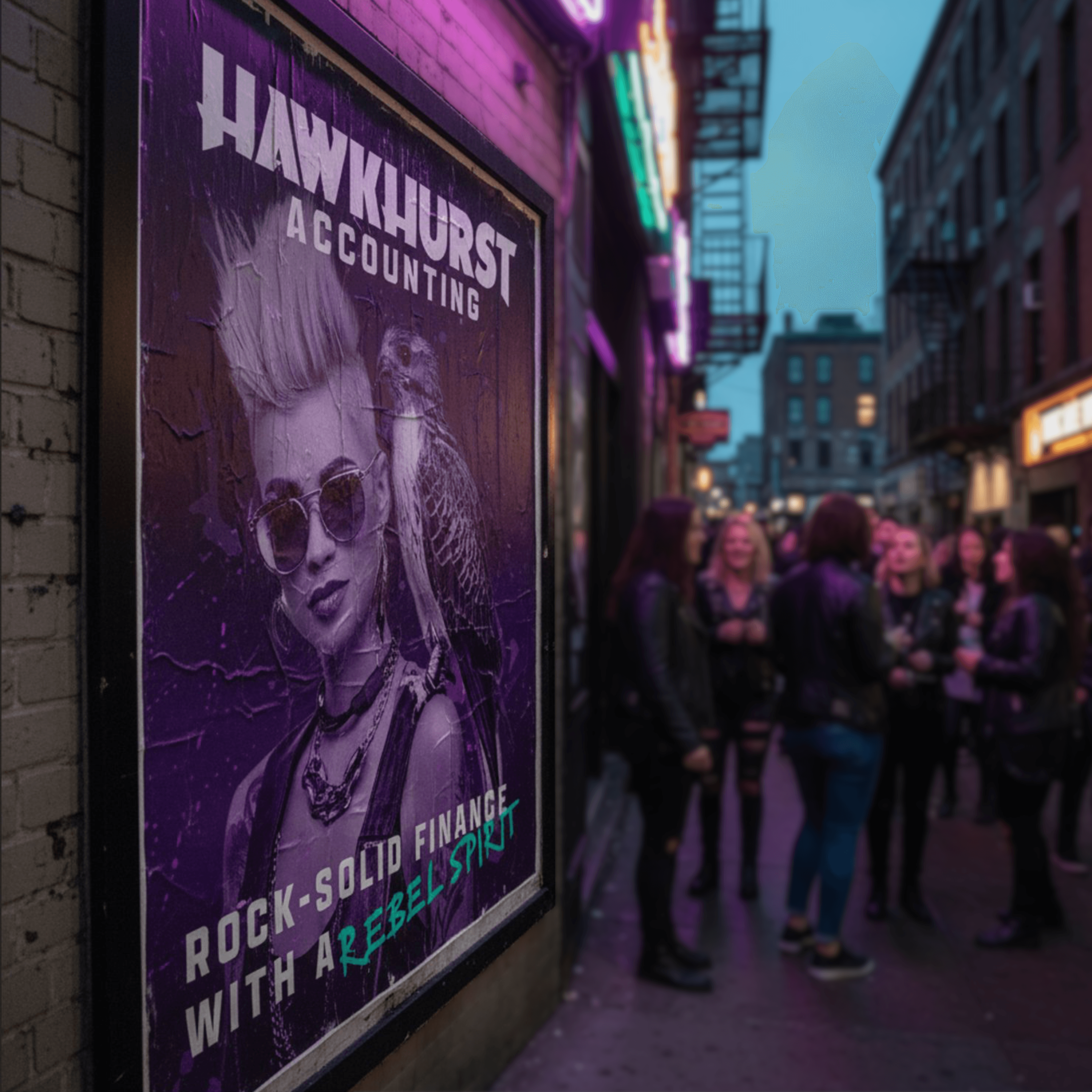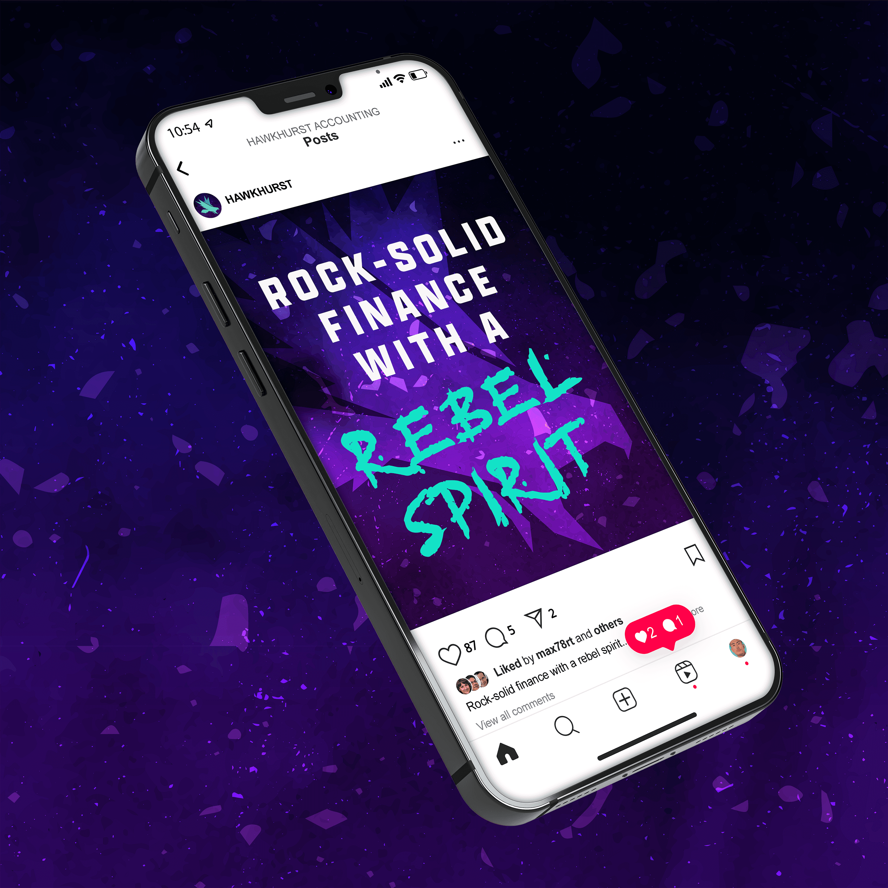 The strapline is where things get interesting. The top line stays clean and structured, reinforcing the trust and reliability that any credible accountancy brand needs. Then "REBEL SPIRIT" breaks loose. Raw brush lettering, full of energy, and deliberately disruptive. It says everything about what makes Hawkhurst different.